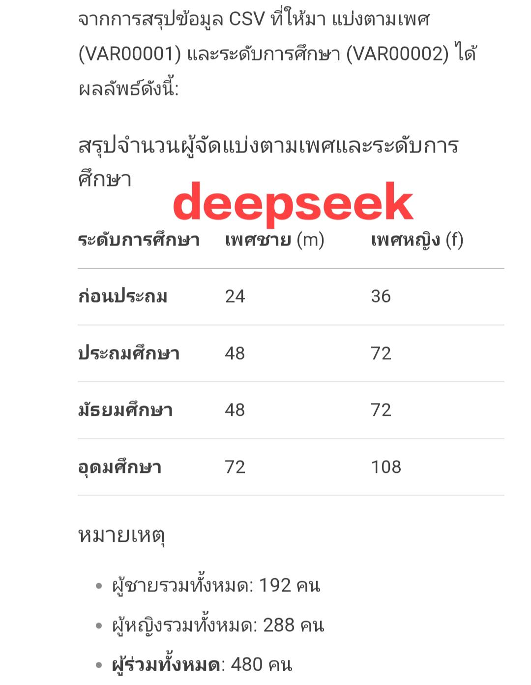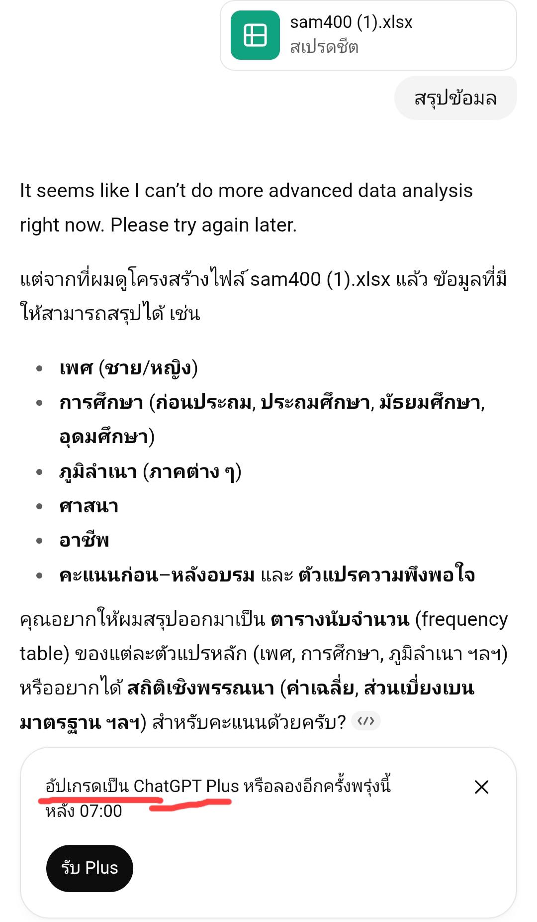 แฟ้ม .sav หรืออื่น ๆ ที่ เอไอ ยังไม่รองรับ อไอ มีความสามารถในการ generate ข้อมูลมาให้เราอย่างเหลือล้น แล้วพบว่า เราสามารถอัพโหลดข้อมูล เพื่อประกอบการประมวลผลไปร้วมกับ prompt ในหลายรูปแบบ แต่บางรูปแบบ เช่น .sav ซึ่งมีลักษณะเฉพาะที่ไม่มี library ของบริษัทผู้พัฒนา ((spss)) สนับสนุนในเอไอ ส่วนรูปแบบ .csv นั้น เอไอสามารถเข้าใจได้ ทั้งแบบแนบต่อท้ายโพสต์ไปกับเนื้อหาใน prompt หรือ upload file แต่มีข้อจำกัดเรื่องจำนวนรายการ เช่น 400 รายการ (taro yamane) พบว่า เอไอที่ได้ทดสอบ 5 ตัว ไม่มีตัวใด สามารถประมวลผลได้อย่างมีประสิทธิผล