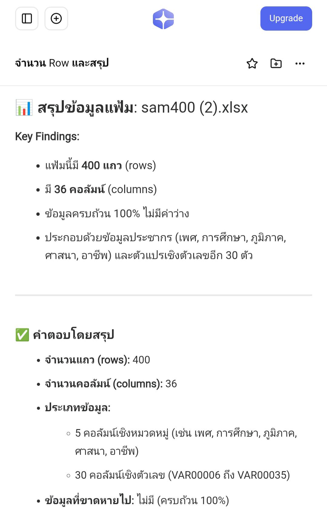 การประมวลผลข้อมูลจากแฟ้ม excel ารประมวลผลข้อมูลจากแฟ้ม excel พบว่า เอไอ หลายตัว รับแฟ้ม xlsx ได้ แล้วประมวลผลข้อมูลใน sheet ได้อย่างถูกต้อง จึงสร้างตัวอย่างข้อมูล 400 (sam400) รายการ แล้วส่งให้ A.I. ประมวลผล ได้แก่ chatgpt, perplexity, gemini, you, copilot ได้ผลดังในภาพ